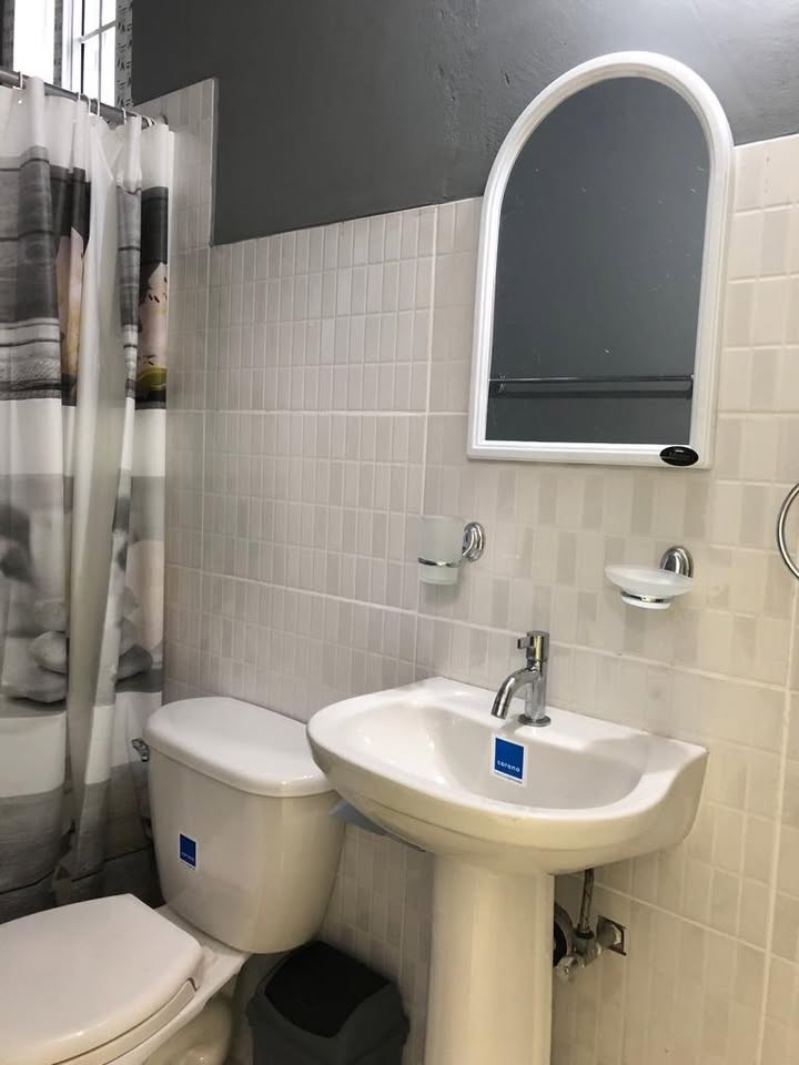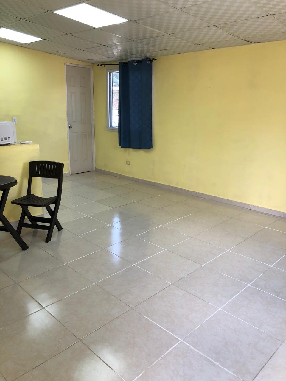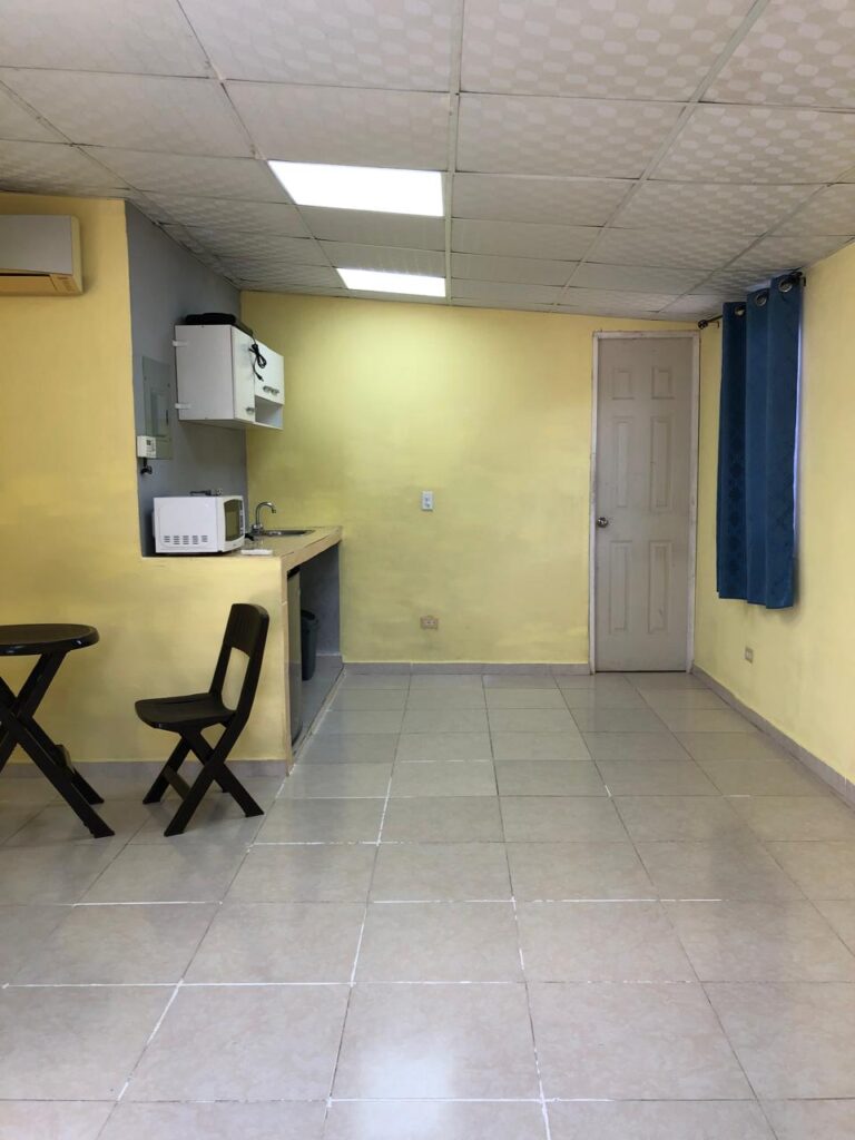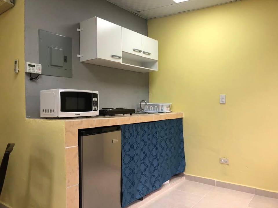 El cuarto cuenta con: *Rack de metal para colgar ropa. * Cama twin (canapé) * Smart TV. * Abanico de piso de 3 velocidades (potente). * Acondicionador de aire inverter. Cocineta con: * Mueble aéreo para víveres y utensilios (alacena). * Microondas. * Estufa eléctrica de 2 quemadores * Refrigerador con congelador de 5 pies cúbicos. * Desayunador de 2 puestos. * Fregadero. * Tinaco para basura. Baño completo: * Inhodoro * Lavamano con base de pie. * Tinaco para basura. * Ducha con agua caliente. El apartamento ya cuenta con el servicio de agua potable y tiene servicio eléctrico en pre-pago.